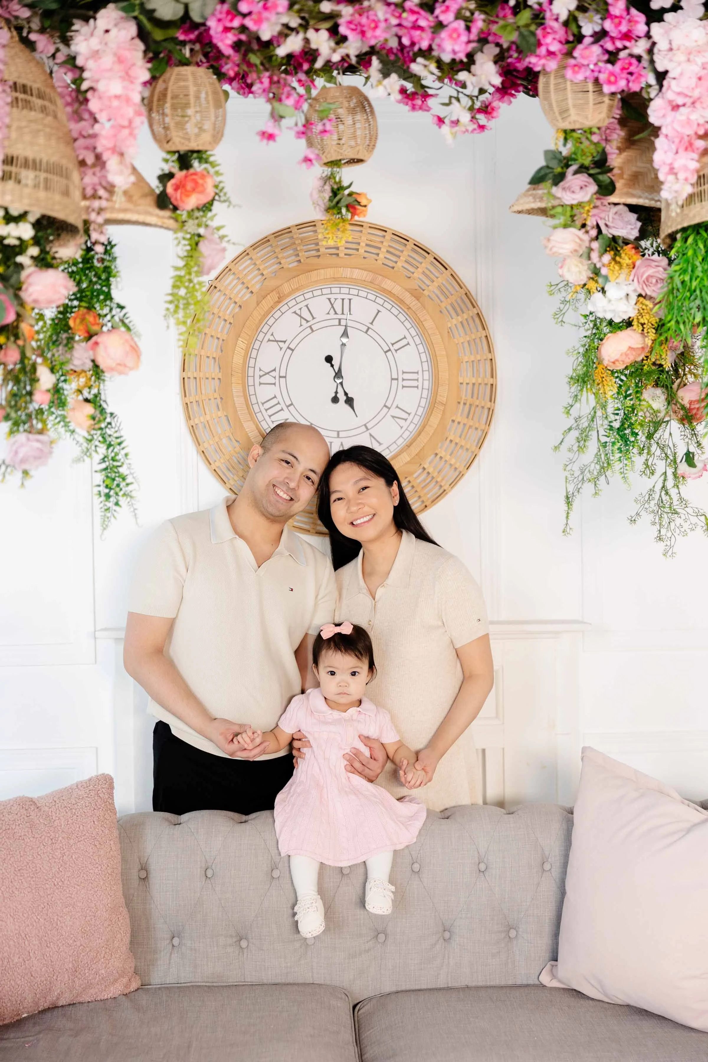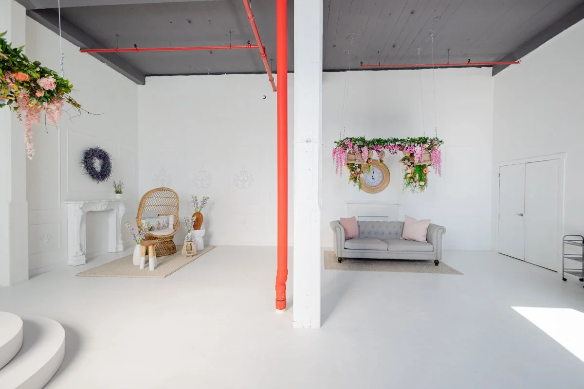 A dreamy, vintage-inspired space featuring soft blue wall and a classic pink sofa that feels straight out of a storybook. Simple, elegant, and romantic, this set allows the focus to stay on connection and emotion while offering a timeless fine-art look. Designed to feel calm and intentional, it’s a beautiful backdrop for preserving meaningful moments.